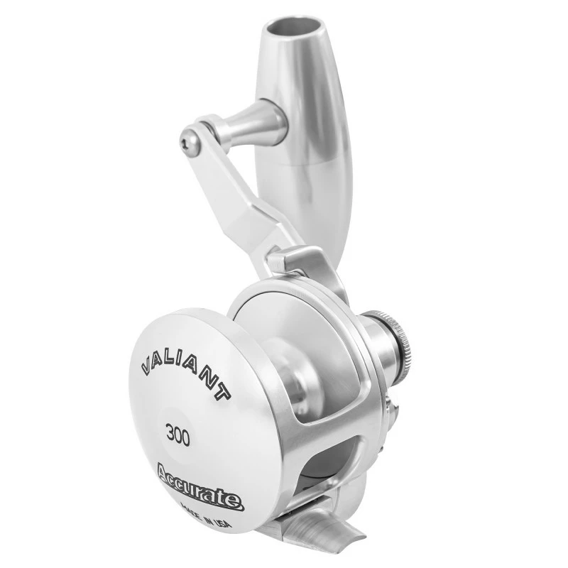 The Accurate Valiant 300-SPJ Slow Pitch Jigging Single Speed Reels were designed with the SPJ enthusiast in mind. We took our popular Valiant 300 removed the clicker added an optimized arm length and our popular SPJ knob for added comfort while jigging. The curved design of the frame and sideplate allowed us to design a reel that is incredibly light, but extremely strong.
