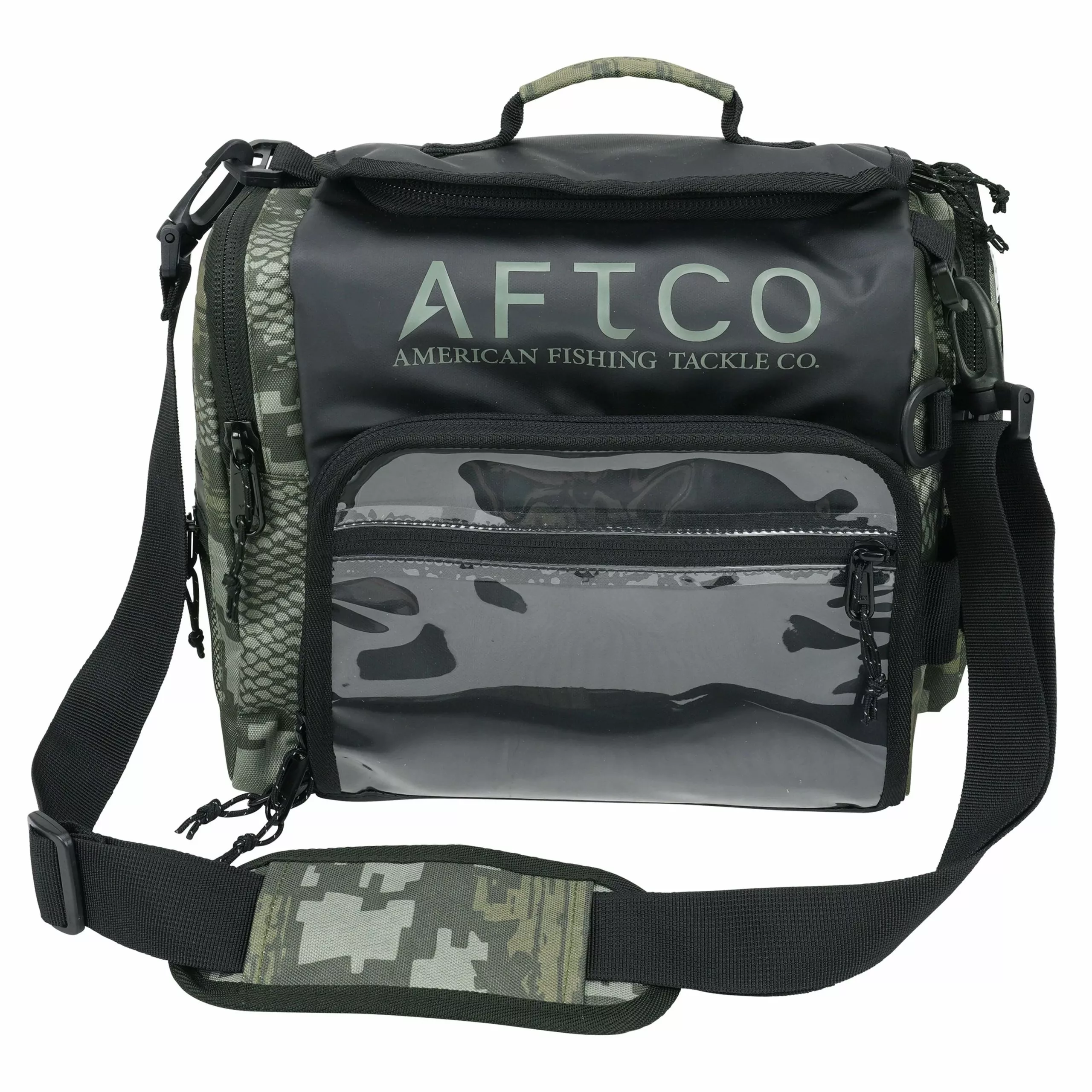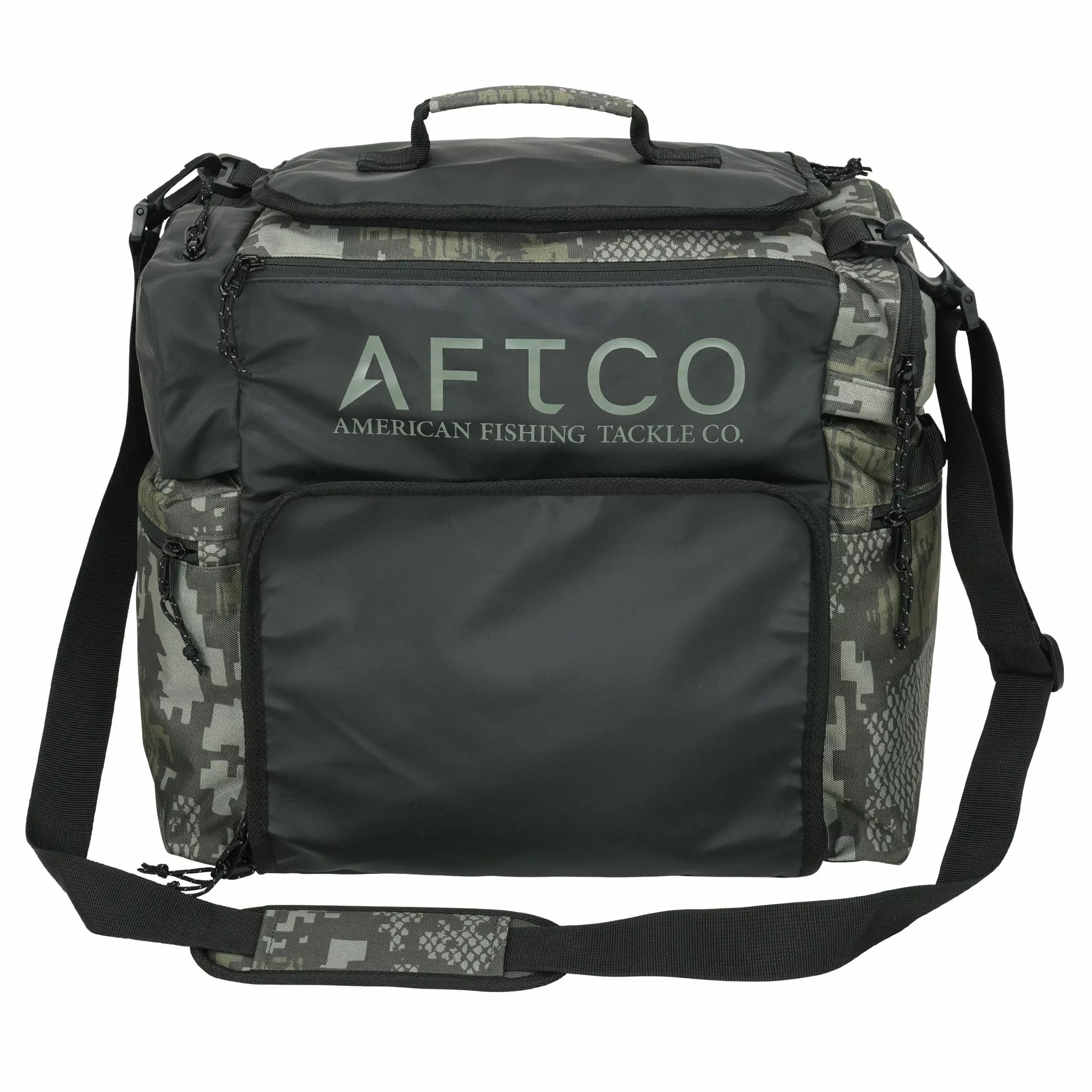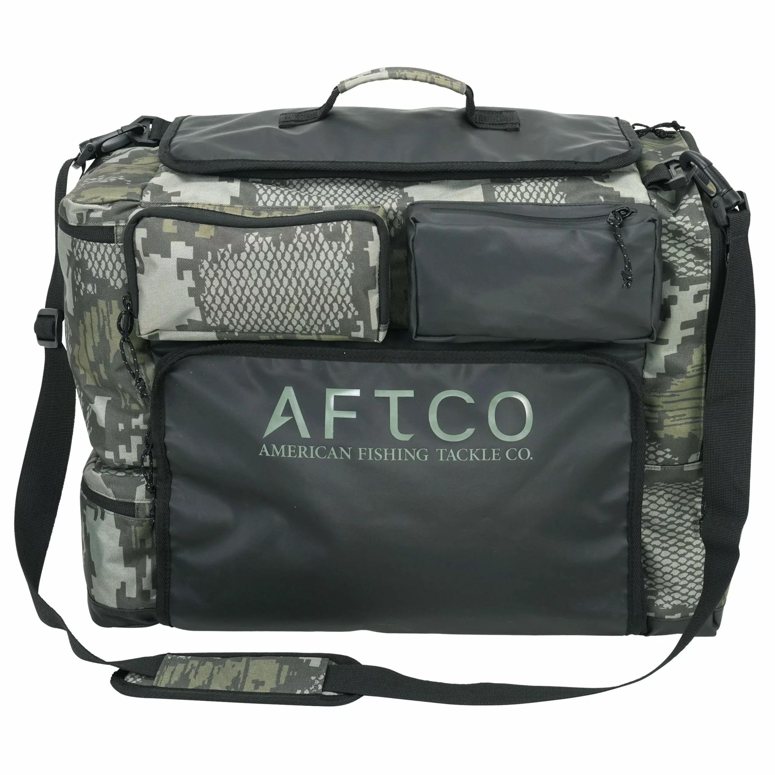 The AFTCO Tackle bags were built for all types of fishermen. The main compartment will hold 4 – 3500 size boxes which has plenty of room for all of your lures. The side pocket is also large enough to hold an additional 3500 size box and has a spot to hold pliers and scissors. One of the highlight features of these bags is the lure nest. A custom die cut piece of EVA that can hold hooks and lures making swapping out lures easy and keeps your best performers ready to tie on at a moments notice. The front of the bags have a large pocket with a clear panel which helps locate items easier. The AFTCO Tackle Bags were made out of a 600D recycled polyester with Nylon Zippers and a seam sealed Tarpaulin base which helps keep water out if laid on a wet surface. The Tackle Bags also have an adjustable shoulder strap, die cut jar holder in the top pouch, and two rod holders built in for bank fishing.