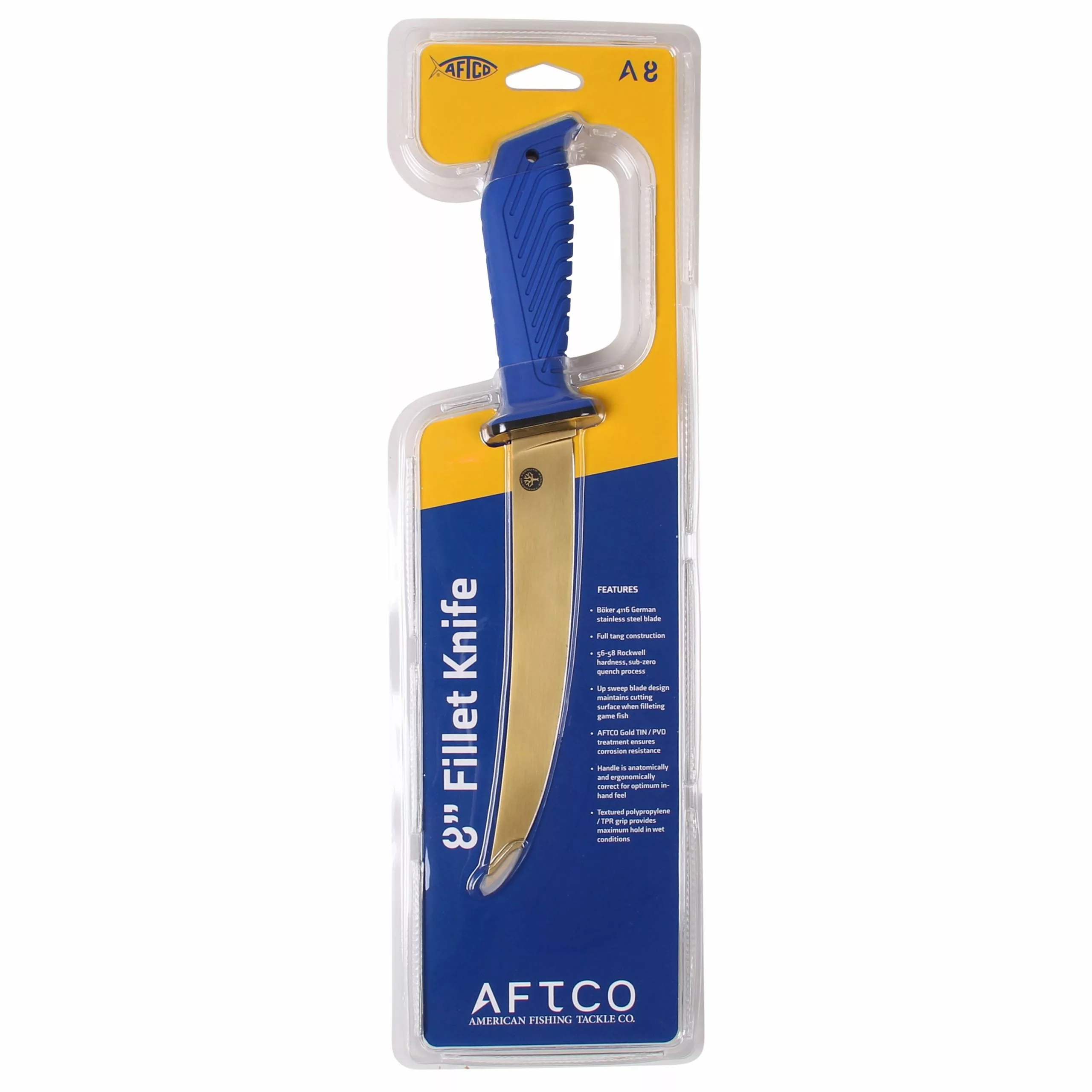 AFTCO’s 6″, 8″, 10″ and 12″ fish fillet knives are built in collaboration with Böker Germany to deliver premium blade options for gamefish processing of all sizes. The range of AFTCO fillet knives feature 4116 German stainless steel blades with a full tang construction and up sweep design. The premium Böker blades are easily distinguished with an AFTCO gold TIN / PVD finish that is bonded to the blade ensuring durable corrosion resistance. A 56-58 Rockwell hardness and sub-zero quench process helps maintain blade sharpness and edge retention. The handle features an over-molded slip-free polypropylene / TPR surface that is both anatomically and ergonomically correct for optimum in-hand feel. From Walleye to Wahoo, AFTCO’s fillet knives will provide the right tools to get the job done.