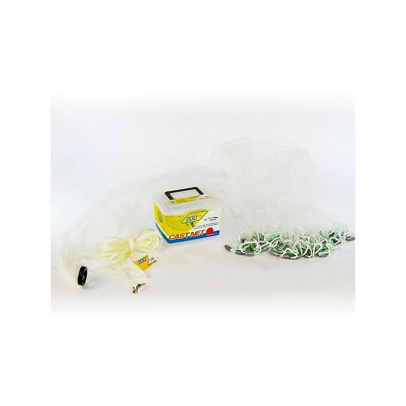 Traditionally the most popular cast net for targeting a variety of bait. The 200 Series Nets feature Premium UBE Chip Monofilament Netting, 3/8 square mesh, 80lbs. test Braille Lines, and 3/4 lbs of actual lead weight per foot. A 24ft. handline is secured with a heavy-duty anodized swivel. Each net is packed in an attractive reusable hard-shelled plastic container.