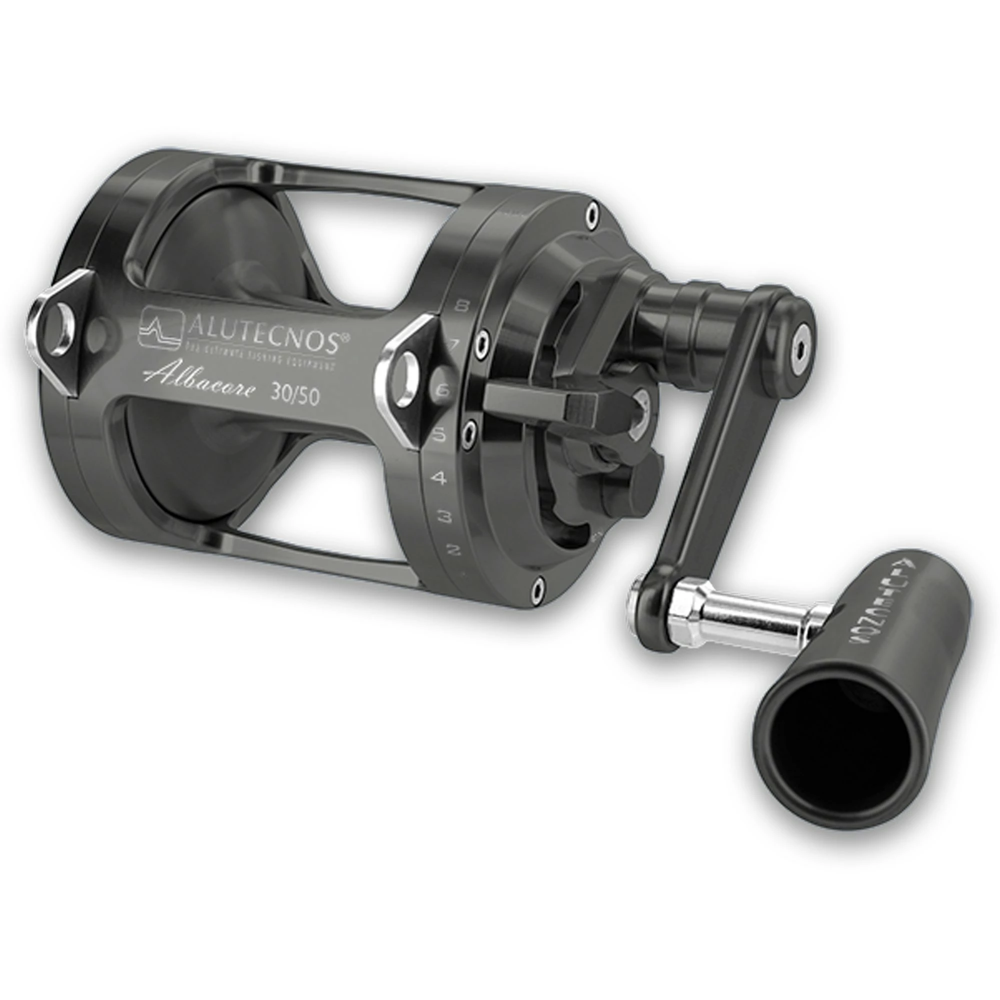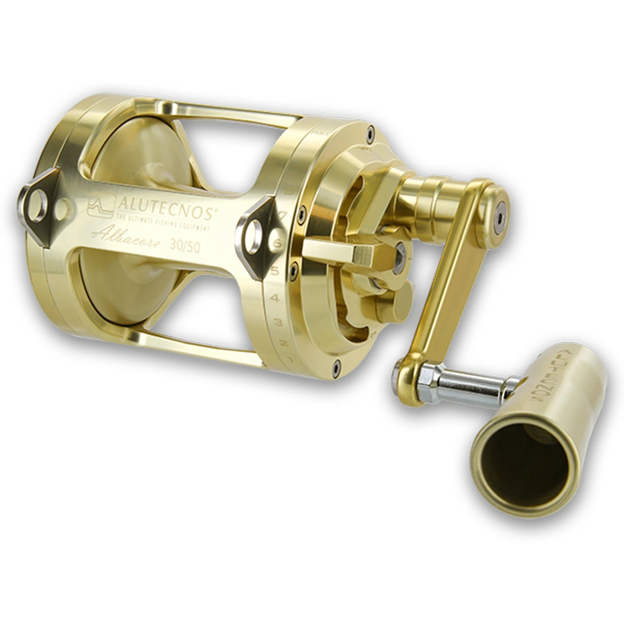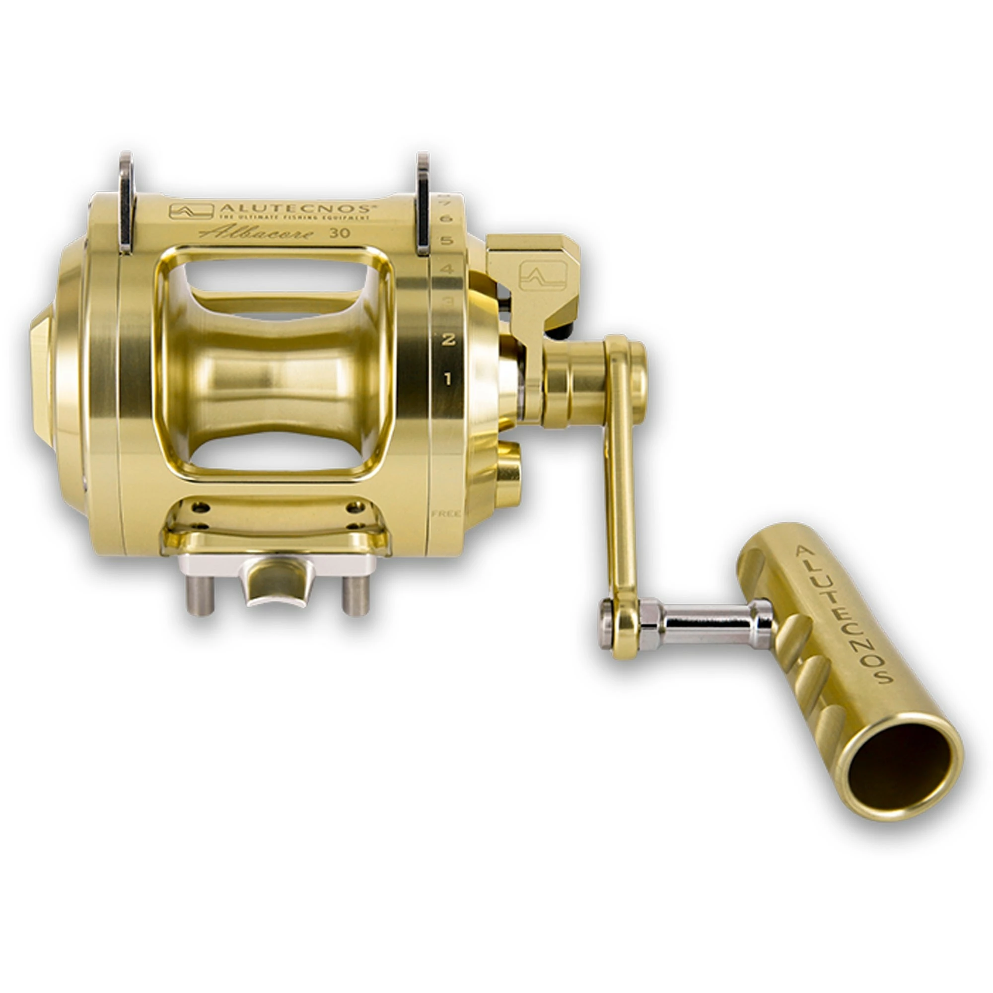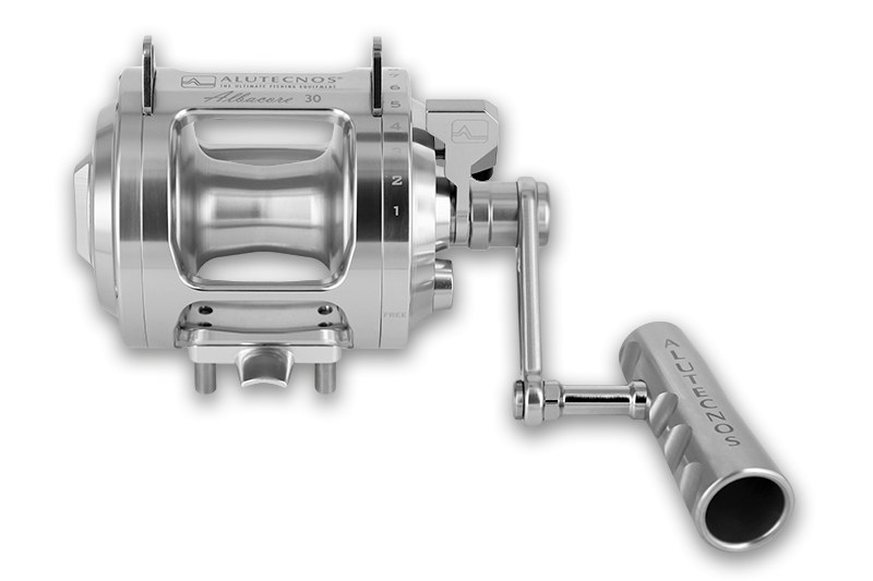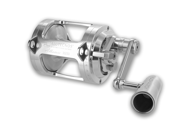Alutecnos Albacore 30 & 30/50 Single Speed Reels are the culmination of a collaborative effort involving all of the staff at Alutecnos. A commitment aimed not only at improving the technological content, but also at paying attention to design. The result is a product that stands out for aesthetic and technical aspects with outstanding attention to details. Such details include the infinite “antireverse” system applied to trolling reel for the first time. The frontal cam and lock release button for placing the automatically rearming gear lever into “free” or “full” mode. Five bearings and gears made from tempered stainless steel guarantee further resistance from corrosion. The system for anchoring the reel to the rod is robust and reliable using four anchor screws. The drag washer is made from the latest carbon composite and is appropriately protected to ensure smooth and consistent use during the most intense battles, the occurrence of “stick-slip” is virtually eliminated. All of the aluminum parts have been buffed ultrasonically cleaned, polished and anodized with a gold or silver finish. All of the parts have been machined from bars using CNC working processes and are subjected to rigorous dimensional and quality control checks. Particular attention is paid to processing cycles and the careful selection of the highest quality of raw materials and components available. The results in a technically perfect product.