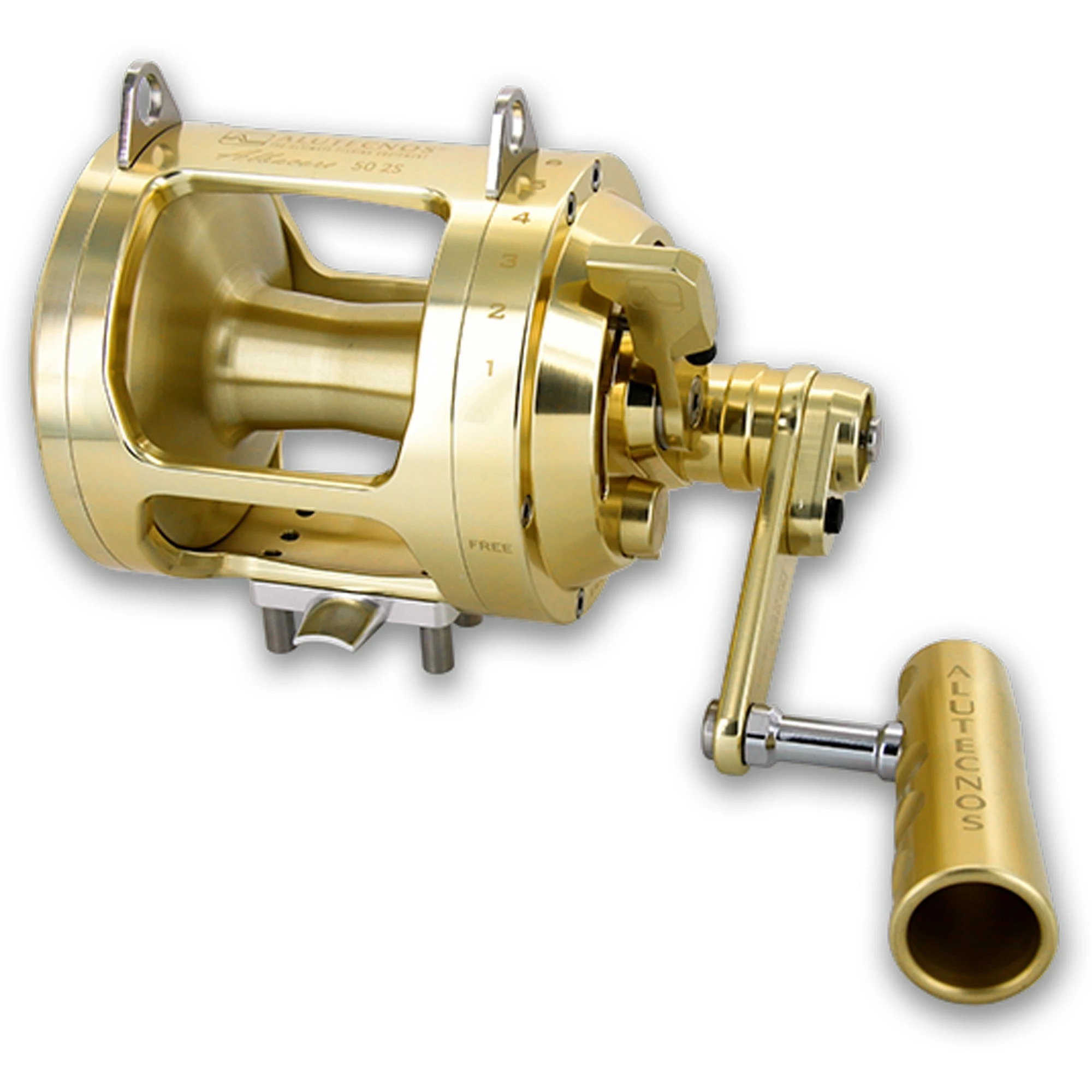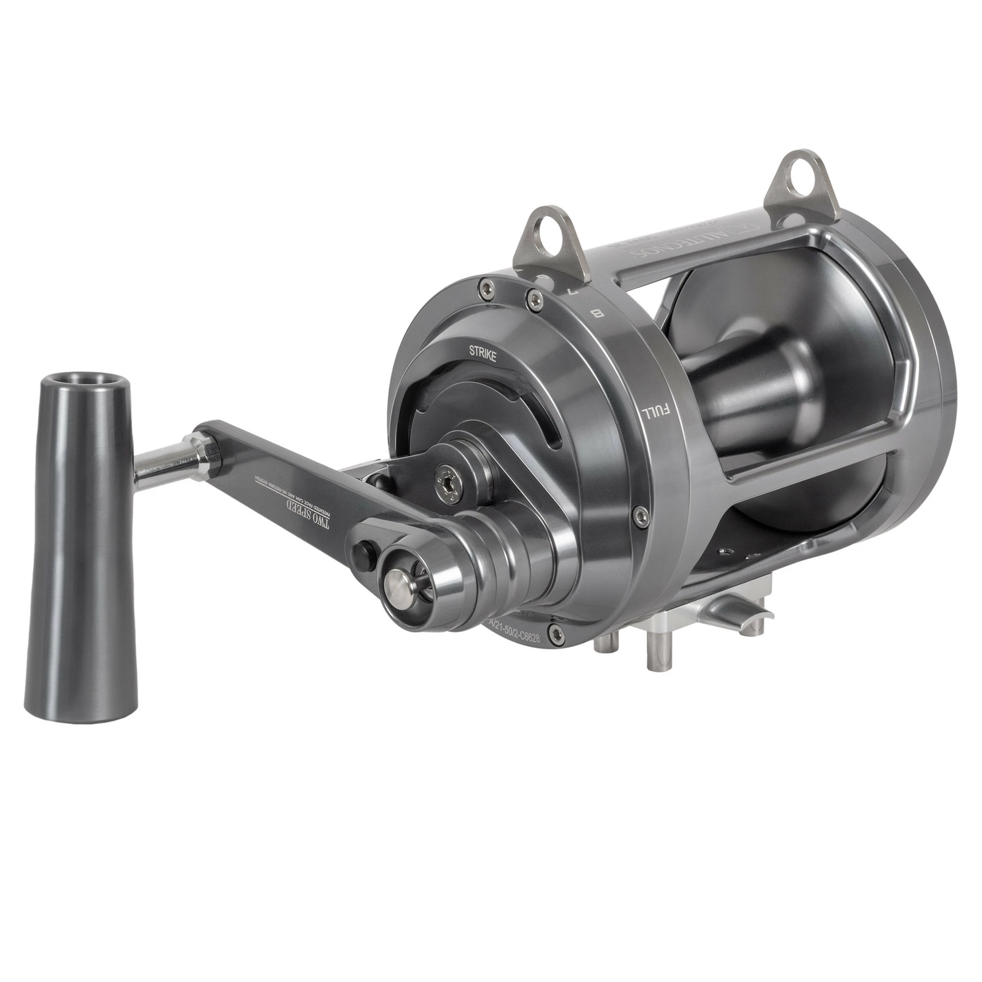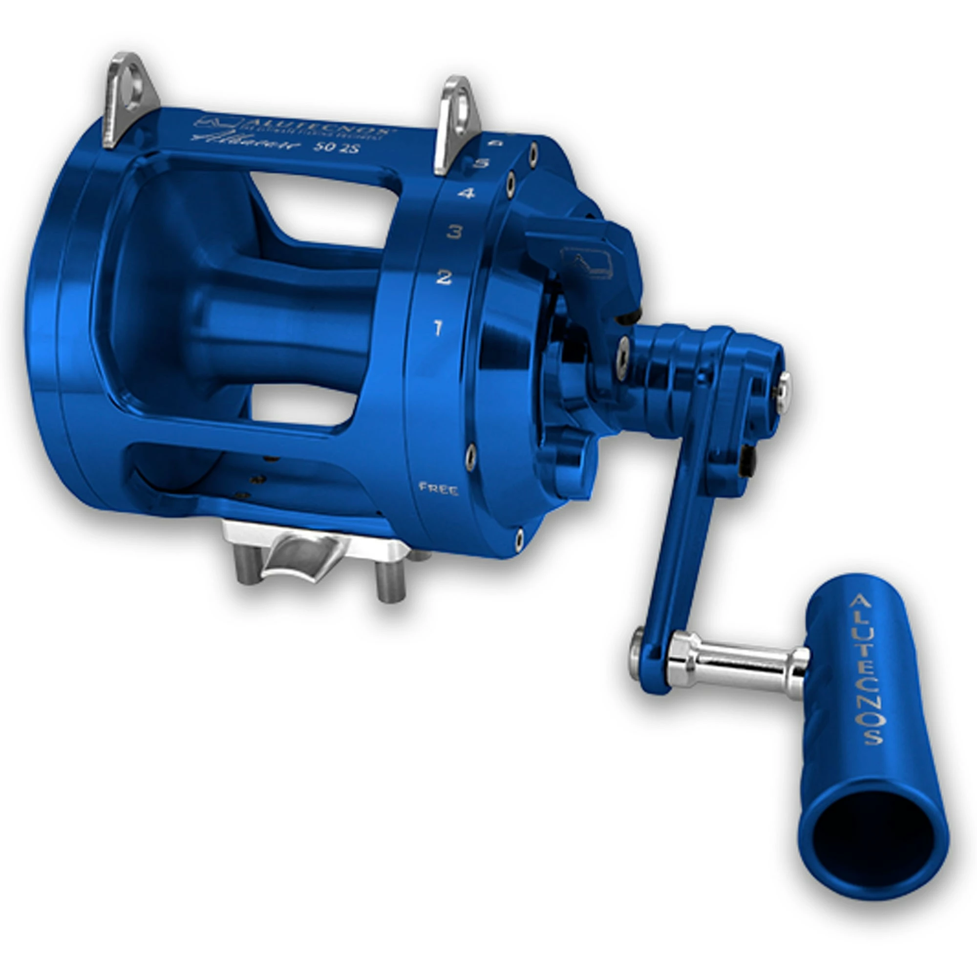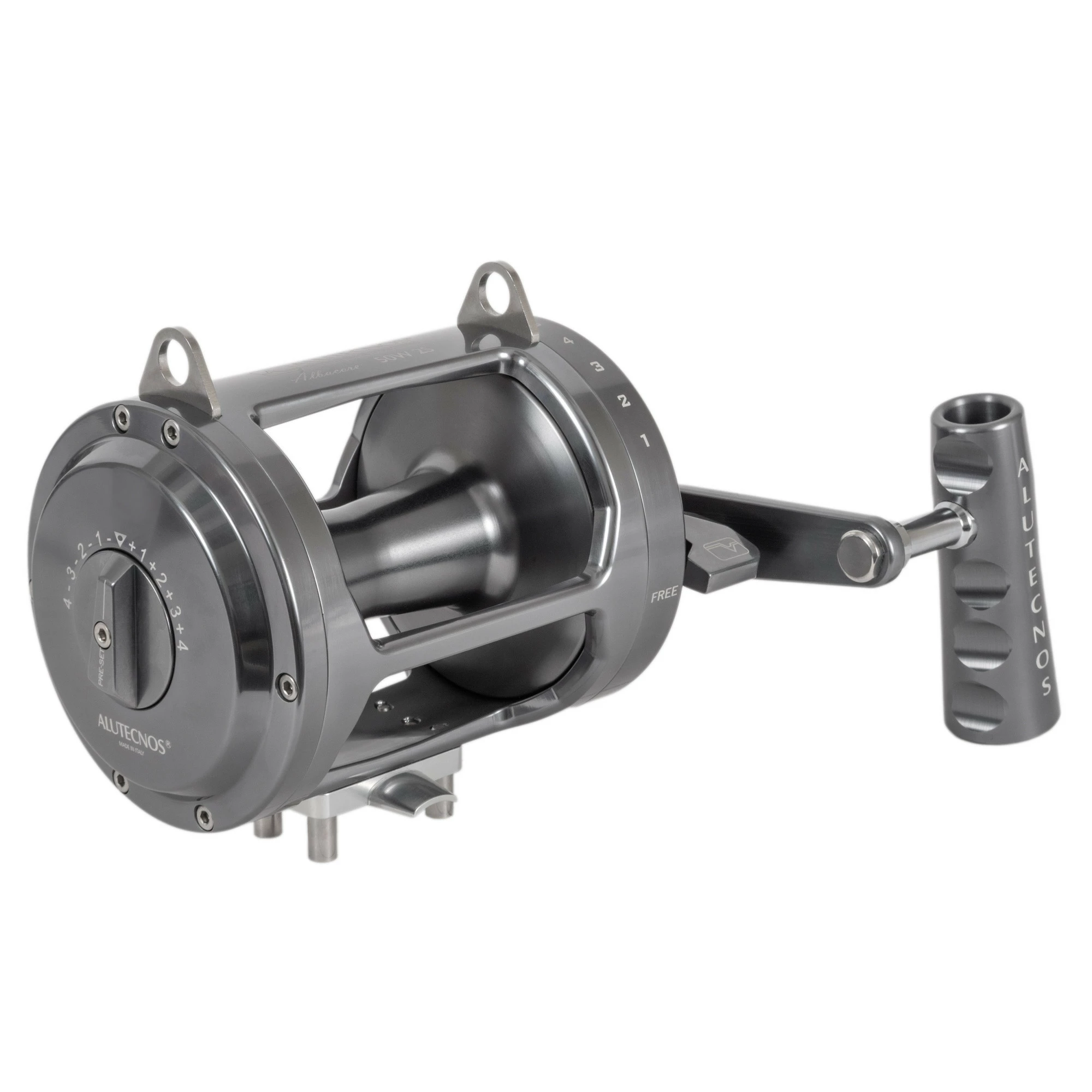 Alutecnos Albacore 50 Two Speed Reels feature the “infinite antireverse” system or the right flange made as a single component through mechanical CNC processing and applied to all models. The system used for engaging the “Two Speed” utilizes a Two-Button gear change unit making gear changes more rapid, simple and intuitive. As with the one speed model, it is equipped with five protected stainless steel gear wheel and gears and a drag washer made from the latest carbon composite. These characteristics ensure long hours of fighting while maintaining sound braking characteristics and smooth reeling and eliminating the occurrence of stick-slip. All the parts have been machined from a bar of a special aluminium alloy specifically manufactured for marine environments, using CNC working processes and subject to rigorous dimensional checks. Particular attention is paid to careful selection of raw materials and components (all of the highest quality) resulting in the manufacture of a technically perfect product. All the aluminum parts have been carefully polished, ultrasonically cleaned, buffed and provided with gold or silver anodizing. Elegant graphics are stamped onto reels using laser technologies and rendering the design indelible over time.