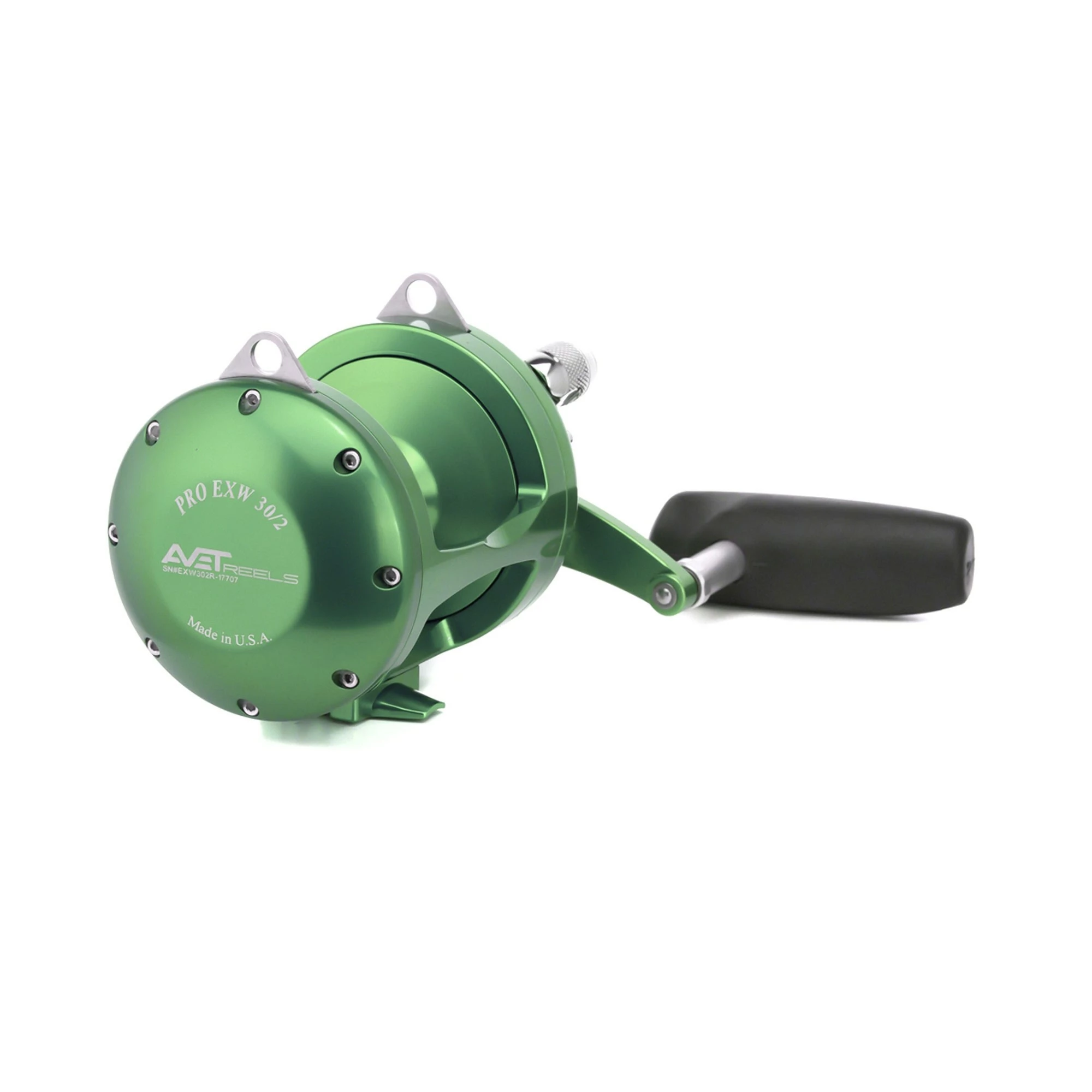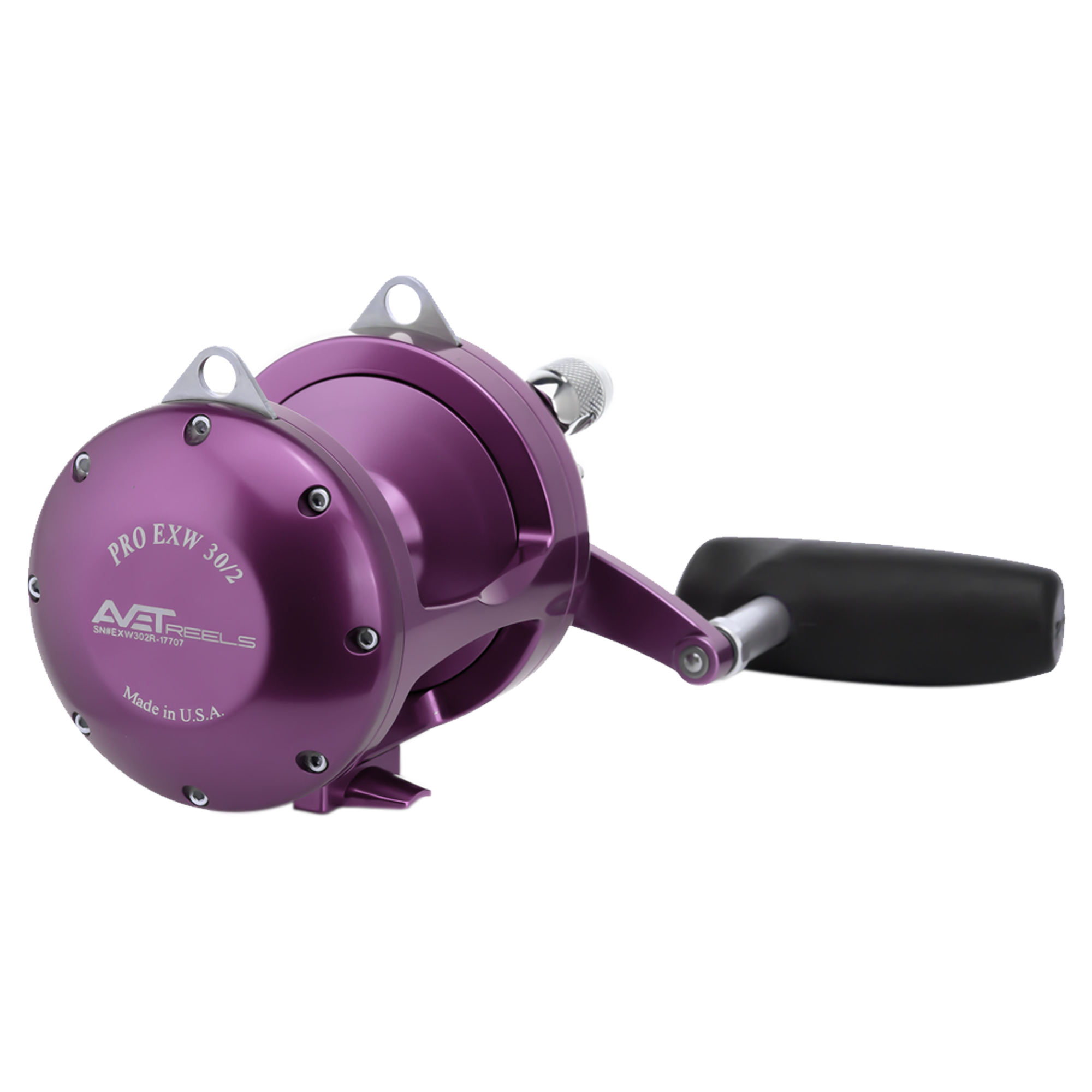 The Avet Pro EXW 30/2 Two Speed is a super strong 30 sized reel capable of 35 lbs. of drag at strike. With its large comfortable ergonomically angled handle knob, these reels will handle fishing heavy spectra and 100 lb. topshots with ease. This wide version to give you more line capacity for tackling large fish on smaller gear. The low gear has extra strength when brute winch power is needed. A great quality reel that is at the top of the market. Avet Pro EXW Reels are able to stand up to those bigger game fish. Two speed mechanism is push button style for ease of use. Avet Ex Reels feature a topless design for casting ease and thumb control for live bait applications. Precision machined stainless steel 2-speed gear transmissions featuring our user friendly quick shift mechanism. These reels are built to last and are reliable when it comes to those heavy fights.