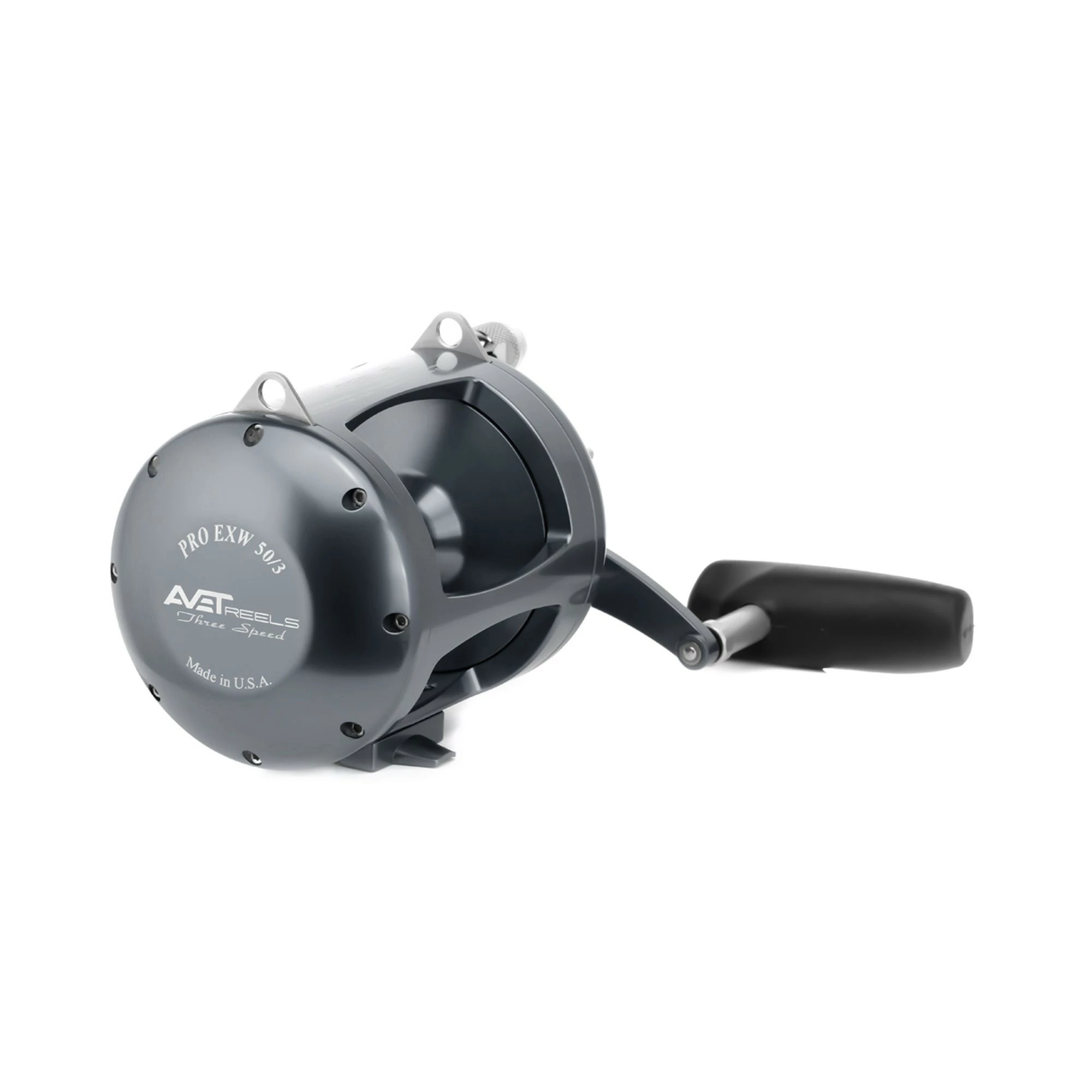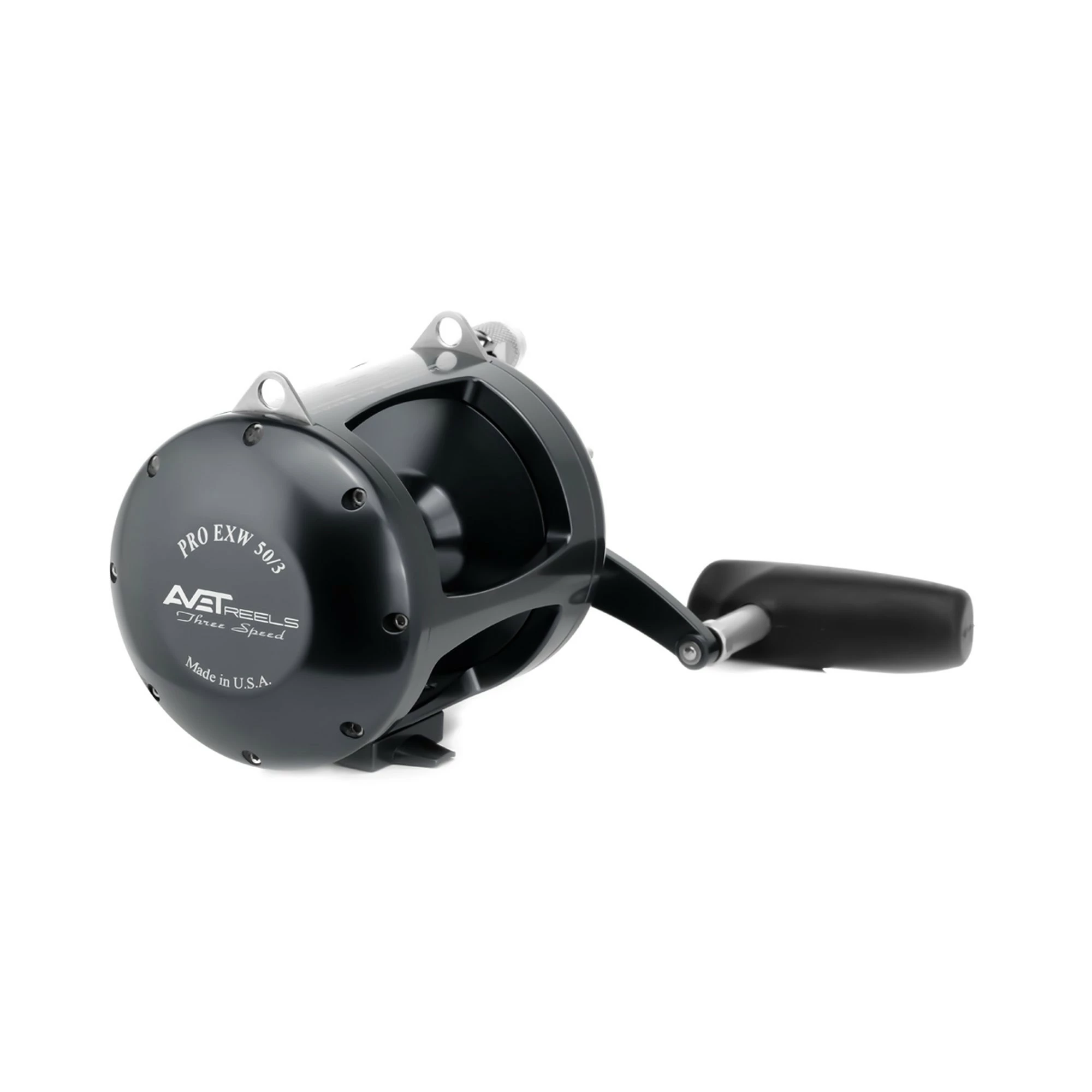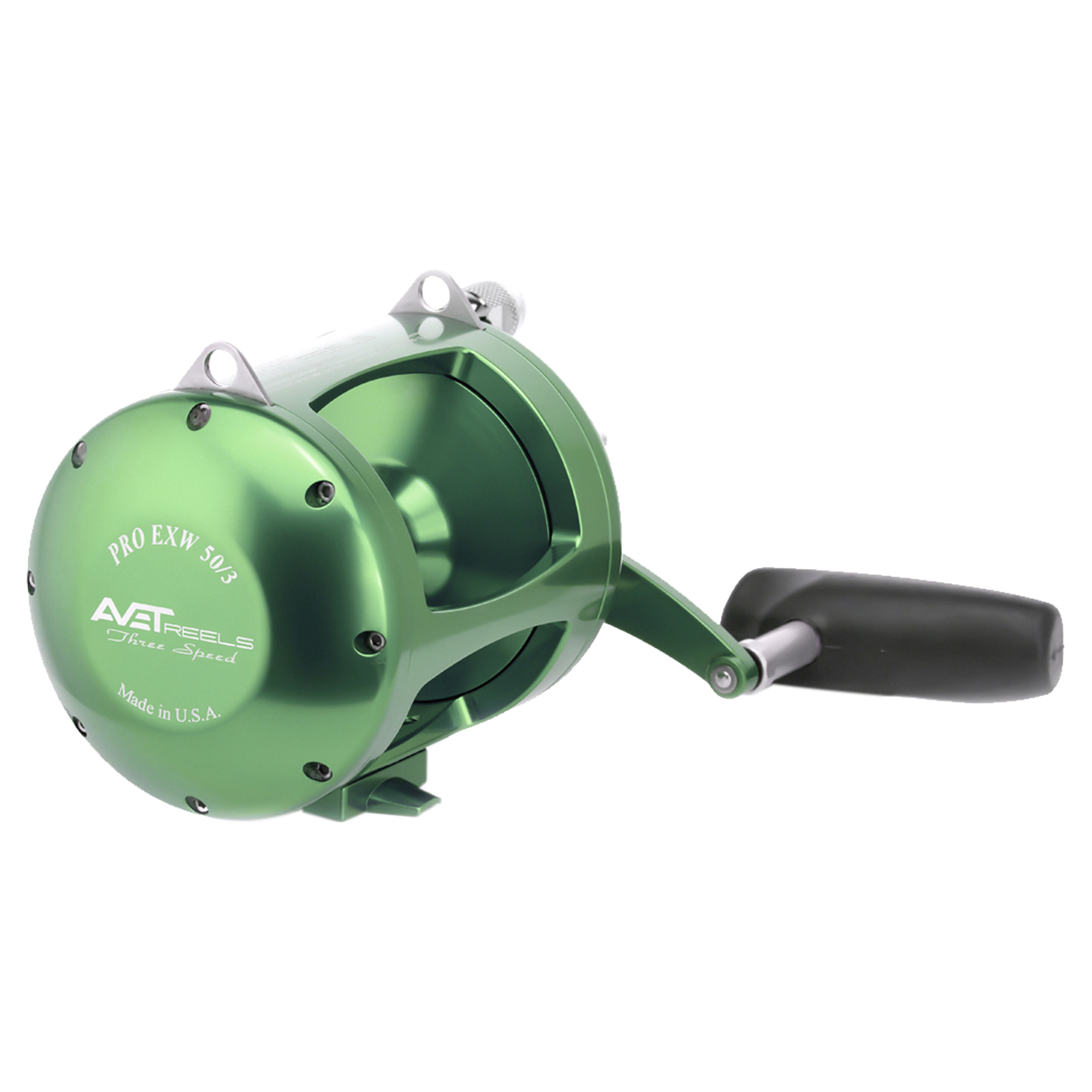 The Avet Pro EXW 50/3 Three Speed Reel contains 3 different gear speed levels in high, medium, and low. The High gear speed allows you to cleared trolled lines at a very fast speed. The Medium gear speed is great for fighting against those big game fish. The low gear speed brings in that extra strength when you need that pure brute power. Containing a powerful lever drag system with adjustable strike pre-set and strike stop button to prevent accidental advancement to full drag. These reels are perfect for your next tackle with a big game catch.