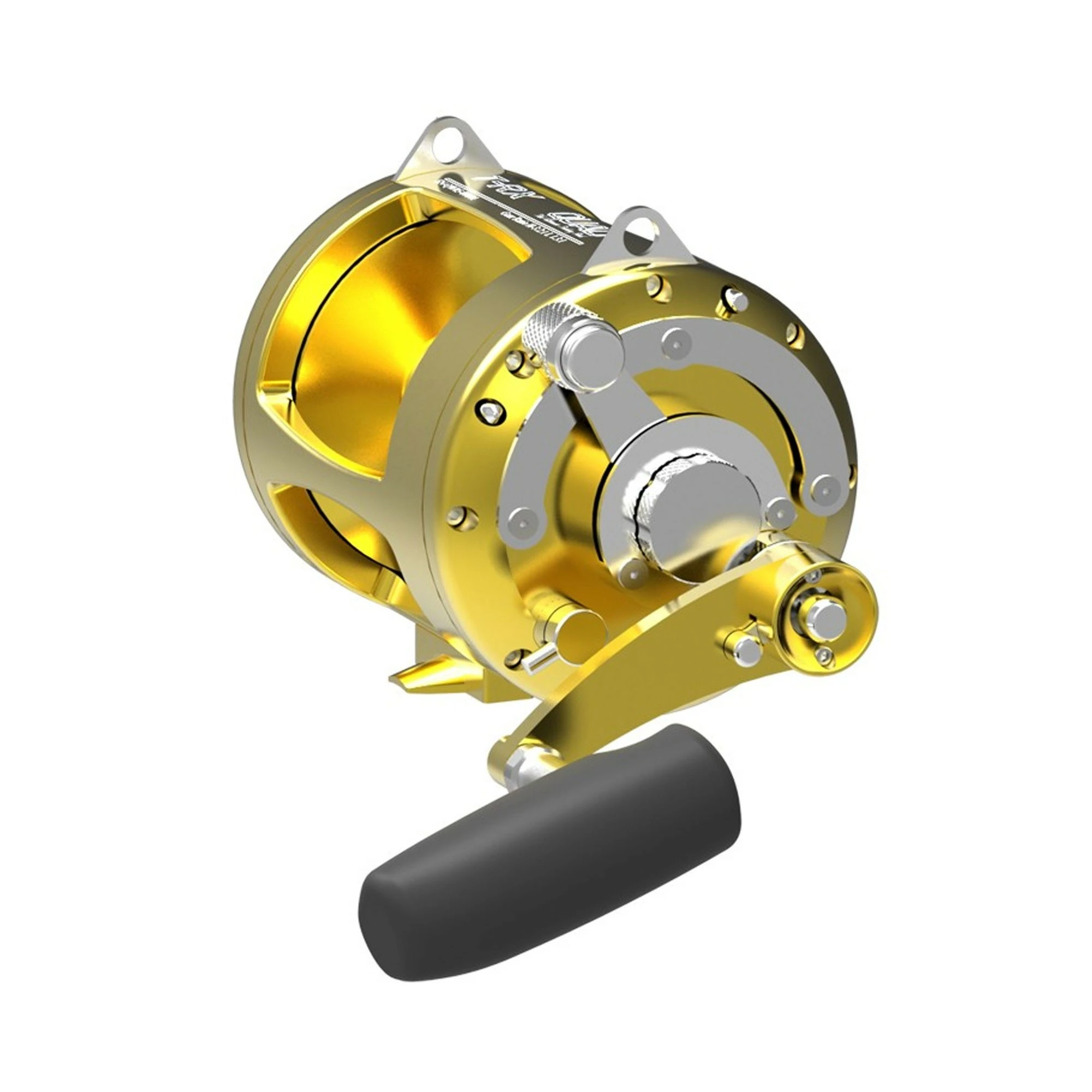 Avet T-RX 50W Quad Reels are the wide version that still contain the four-disc lever drag system that hold the throne over big game reels on the market. Containing a powerful lever drag system with adjustable strike pre-set and strike stop button to prevent accidental advancement to full drag, with more drag surface area than any comparable reel. A powerful 100 lbs. of pressure at strike and 116 lbs. at full setting while still maintaining the free spool capability to fight any big game species. With a fully machined, one-piece aluminum frame and sideplate that is Type 2 anodized for good looks and durability, these reels withstand the test of any big fight and any condition out on the water.
