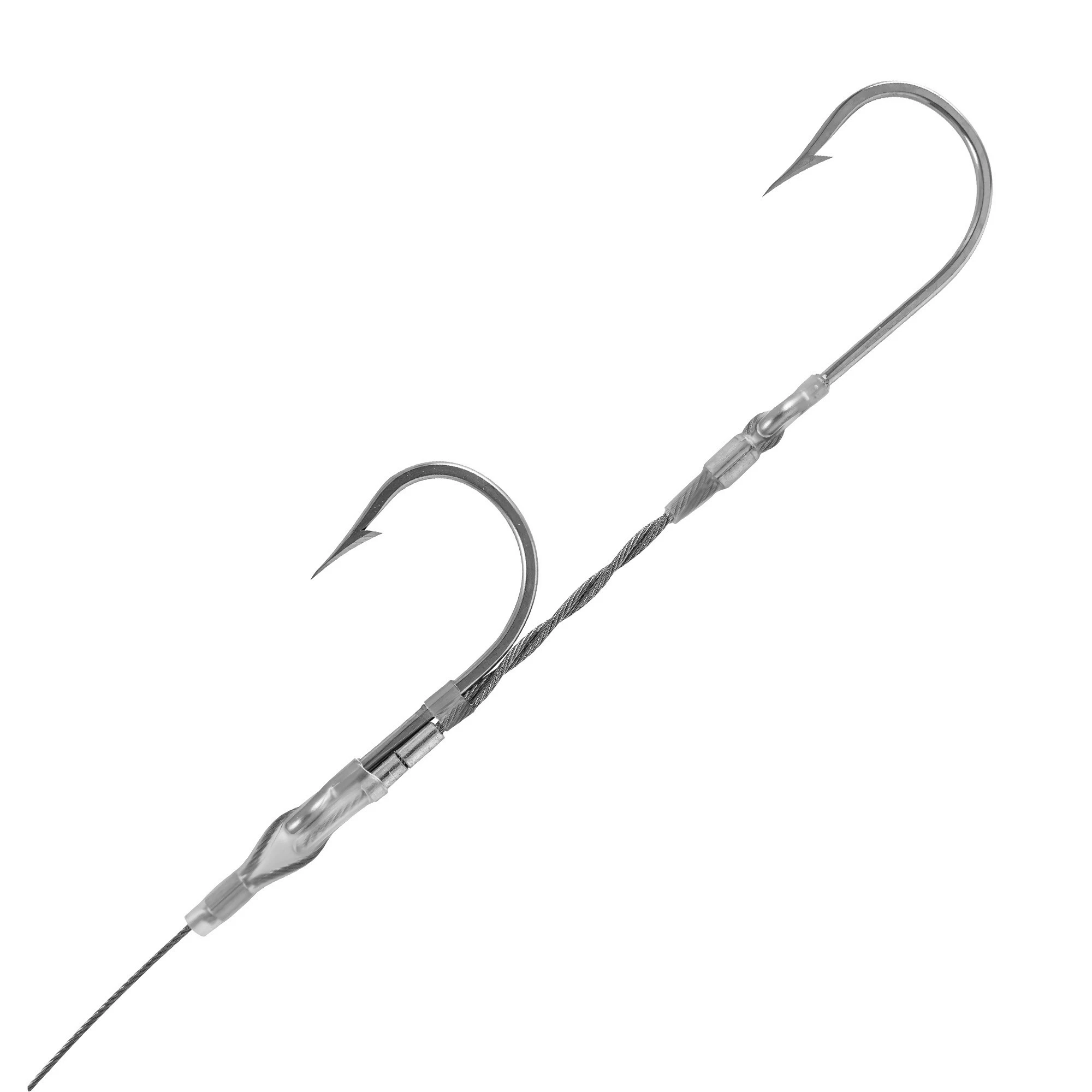 Black Bart Wahoo Double Hooksets come in 3 hook sizes: 9/0, 10/0, 11/0 which have the lengths of 7 1/2″, 8 1/4″ and 11 1/2″ respectively. Length measured from crimp to back of hook.