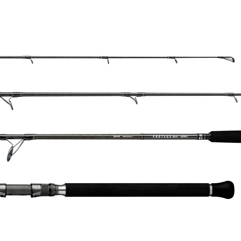 Daiwa Proteus Boat Spinning Rods are destined to create sport fishing memories. Beautiful in appearance and rugged in performance and build, the series was created for the avid inshore and offshore fisherman on both coasts. With a variety of actions to choose from. the line of advanced fishing rods is well-suited for boat fisherman both coastal and offshore. The HVF Carbon Constructed blank is light yet powerfully strong for taming a plethora of saltwater adversaries. The carbon-based rods are lighter and stronger than traditional rod building materials.