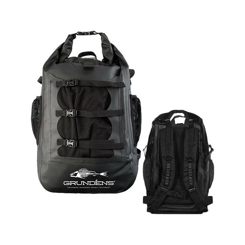 Grundens Tech Rum Runner Backpack features include: 30 Liters of storage 500d PVC tarpaulin fabric 100% waterproof Roll top closure 100% rf welded seams Moisture wicking back panelFront mesh pocket Water bottle pockets andLycra shoulder strap pockets.