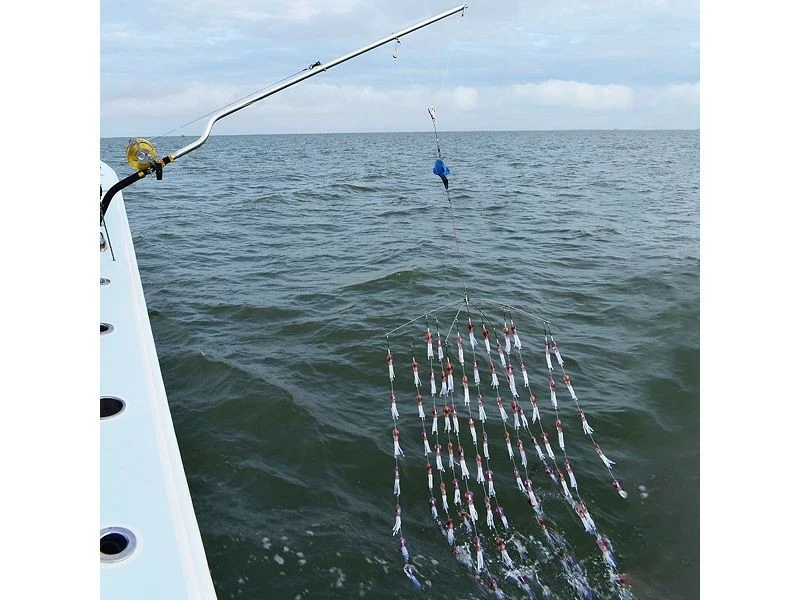 PLEASE NOTE: If you plan to troll at high speeds over 9kts using heavy fishing weights (10lbs+) and high resistance dredges such as XL Mudflap Dredges, we recommend swapping your support cable attachment and first pulley attachment point in order to spread out the load and prevent your boom from bending. The rigged setup shown above works perfect for any other natural or artificial dredges trolled at normal dredge speeds (4-7kts). Dredge Booms sold individually.