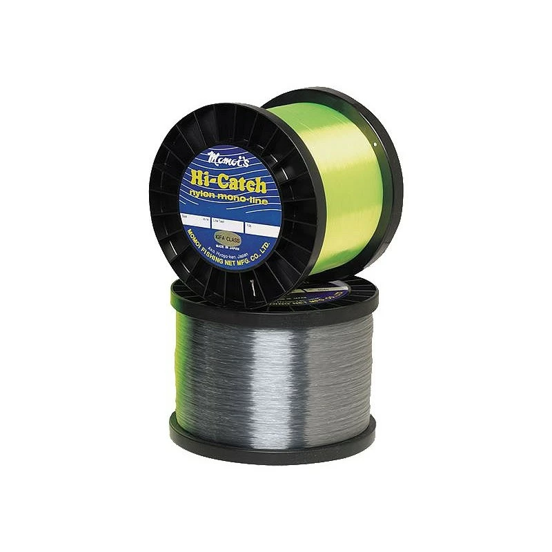 Momoi Hi-Catch Monofilament Line; this nylon line is an extremely high quality monofilament line produced using strict quality controls. It exhibits very low memory characteristics, and is very soft and flexible while maintaining a high tensile strength to diameter ratio. Small diameter lines with tensile strengths result in larger reel capacity when fighting hard charging game fish.