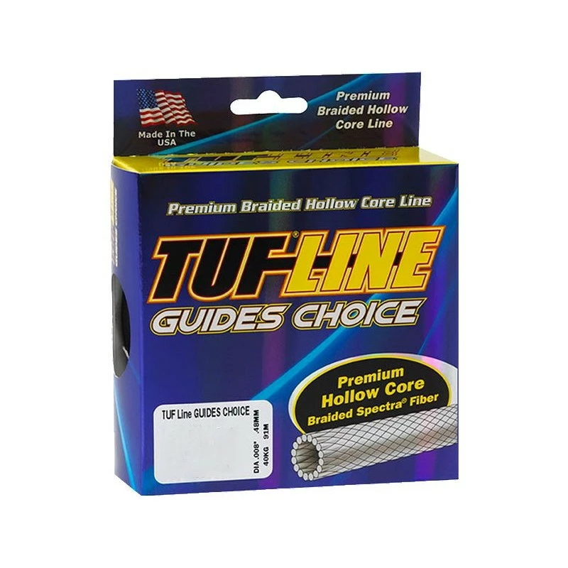 Tuf-Line Guides Choice is a hollow, spliceable micro-filament line. The hollow core design allows monofilament to be spliced into the braid for the strongest possible main line to leader connection. Guides Choice is a must for top shotting monofilament into the braid. Simply insert the end of the monofilament approximately two feet into the braid and use floss to whip the area where the mono enters the braid. Use for making wind on leaders or as a backing for top shotting with monofilament. Use up to 30 lb mono with 40 lb braid, up to 50lb mono with 60 lb braid, up to 100 lb mono with 80 lb braid and up to equivalent lb test mono with 130-, 150-, 200-, 300- and 500lb test braid.