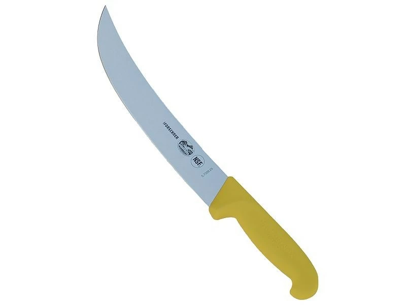 Forschner 10″ Cimeter Knife with Yellow handle features: Hi-Vis Yellow handle, making it easy to locate amongst all your tackle and accessories. Cimeter knives are remarkable for butchering large pieces of meat. It also works great for slicing meats, roasts, roast turkey, ham, and fish into thin and even slices. The number one choice of offshore fishermen.